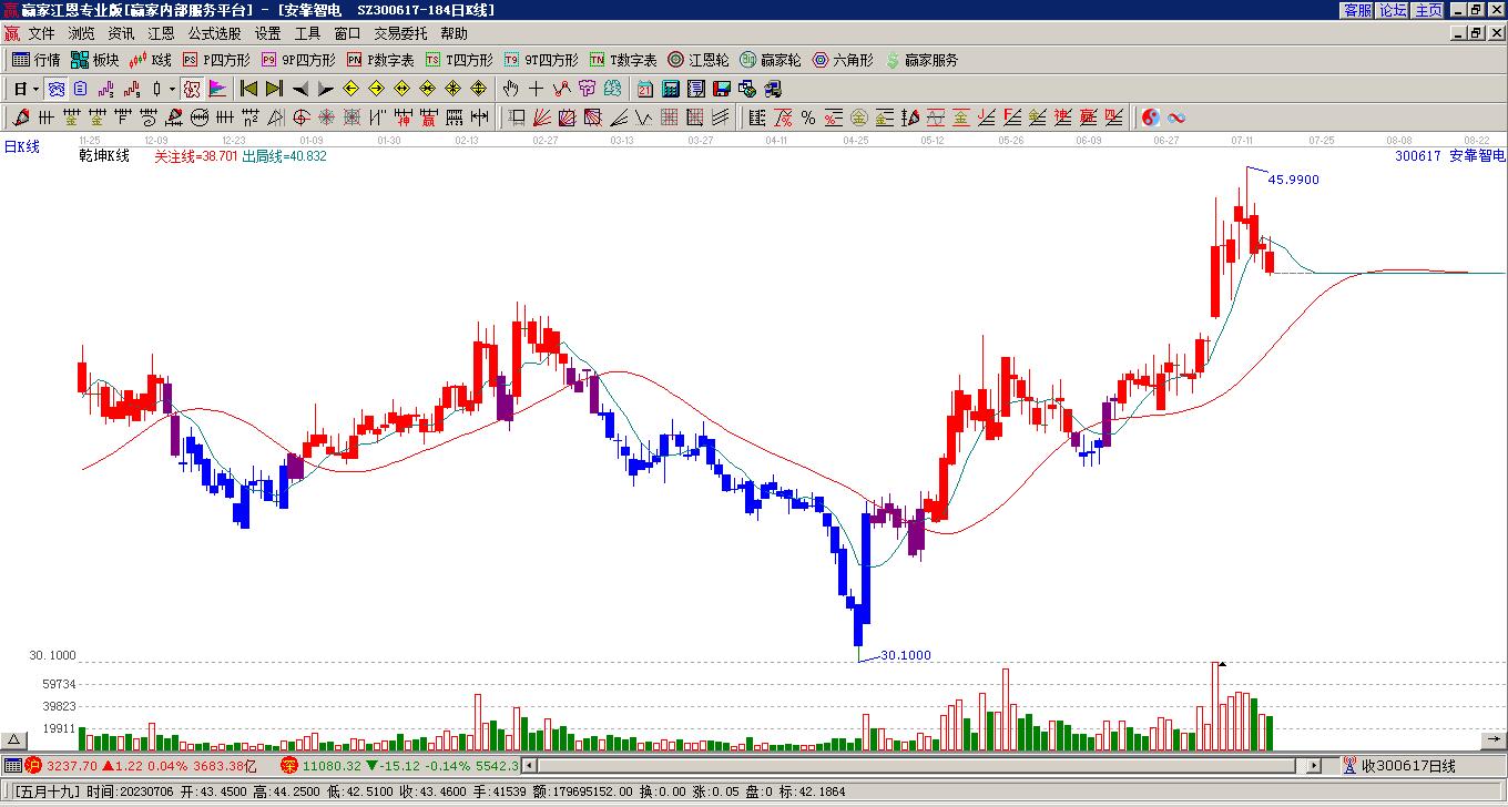 周二安靠智電300617最高價41.5挑戰(zhàn)了贏家極反通道工具上方紅色外軌線,受到上方紅色外軌線強(qiáng)力壓制,最終收盤停留在在上方紅色外軌線與藍(lán)色外軌線上方的超強(qiáng)通道區(qū)域。安靠智電300617近10個交易日