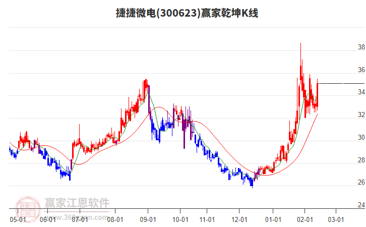 捷捷微電最高價挑戰(zhàn)上方紅色外軌線 小幅上漲2.99%