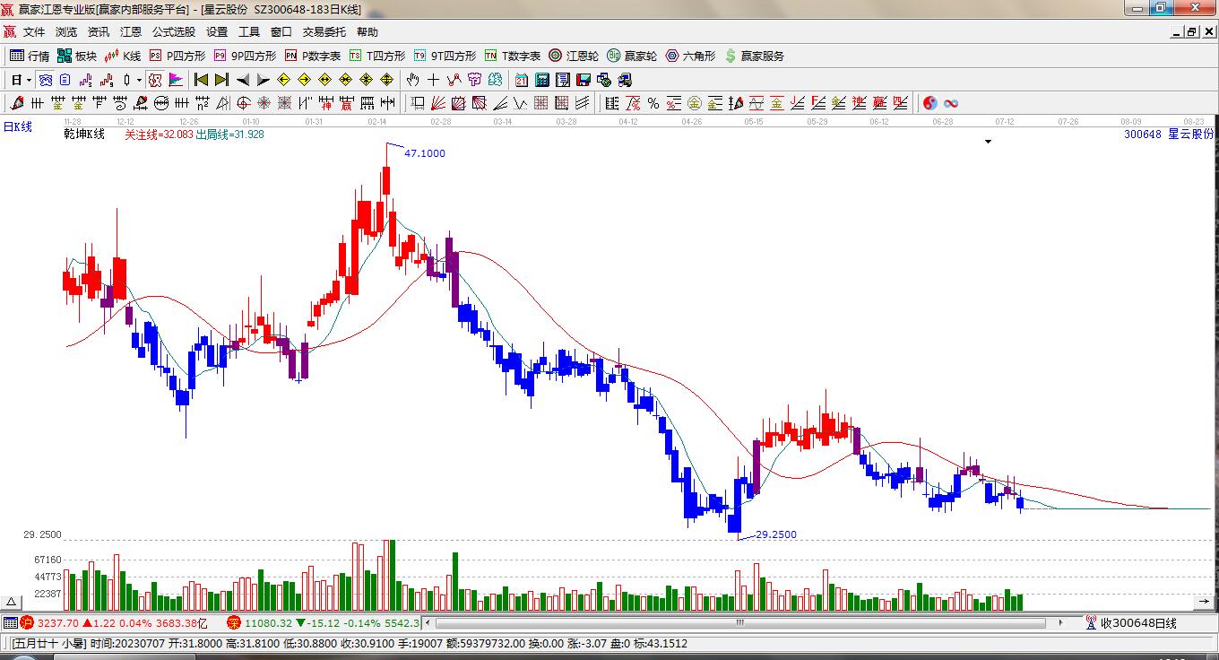 300648星云股份處于贏家江恩多頭主線形態(tài),今日再次發(fā)出江恩底分型并發(fā)出江恩筑底信號,中期雖然處于回調(diào)中,但長期多頭趨勢延續(xù)。星云股份今日跳空高開,截止目前K線穿頭破腳中陽線,上漲能量較為強(qiáng)勢。