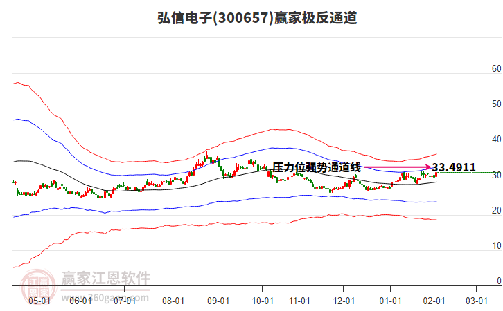 當(dāng)天300657弘信電子最高價(jià)34.28挑戰(zhàn)了贏家極反通道工具藍(lán)色外軌線,受到藍(lán)色外軌線強(qiáng)力壓制,最終收盤停留在在藍(lán)色外軌線與生命線上方的強(qiáng)勢通道區(qū)域。300657弘信電子近10個(gè)交易日漲幅7.82%