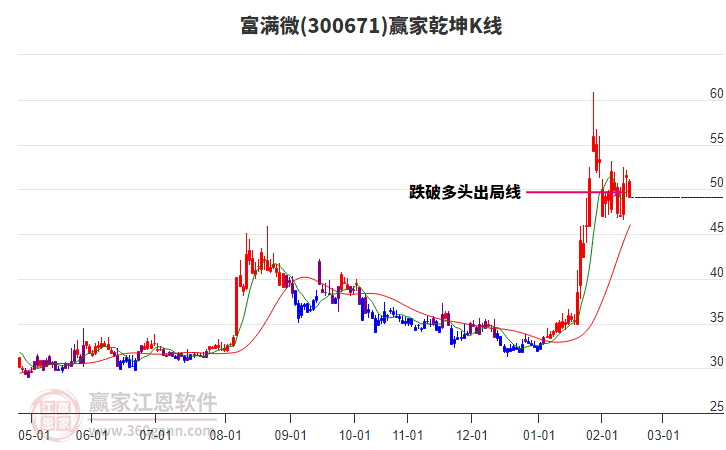當(dāng)天300671富滿微上穿上方紅色外軌線 以上下影陰線收盤