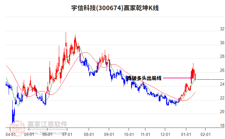 300674宇信科技處于贏家江恩多頭中期回調(diào)形態(tài),從1月14日形成頂分型后持續(xù)下跌,重心下移,今日跌破前低形成短期初次筑頂信號,短期多頭趨勢已被破壞,中長線均在空頭下跌趨勢中。300674宇信科技根據(jù)