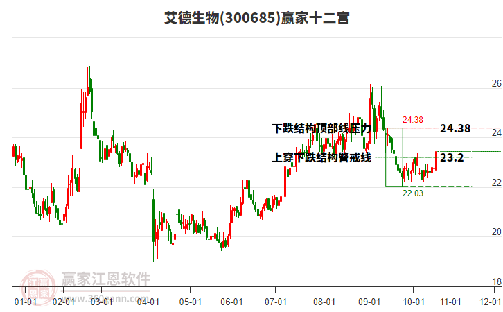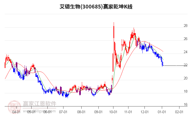 依據(jù)贏家江恩系統(tǒng)趨勢工具極反通道分析判斷艾德生物300685運行在生命線以下弱勢區(qū)域,根據(jù)規(guī)則該股短線輕倉參與,股價跌至弱勢外軌線后波段再結合其它工具信號建倉。應用口訣是:生命線上強勢走,生命線下難抬頭;紅黃兩條外軌線,壓力支撐顯勢頭。