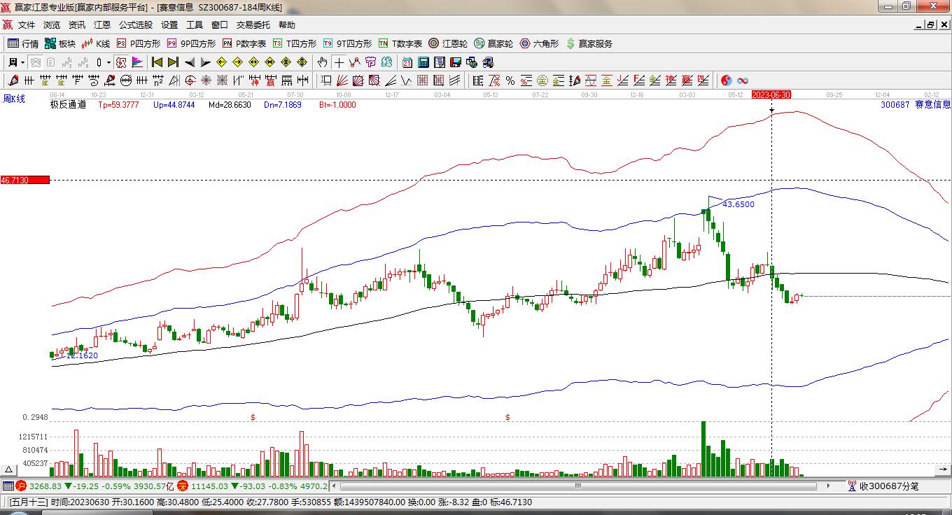 目前賽意信息最高價29.28挑戰(zhàn)了贏家極反通道工具上方紅色外軌線,受到上方紅色外軌線強(qiáng)力壓制,最終收盤停留在在上方紅色外軌線與藍(lán)色外軌線上方的超強(qiáng)通道區(qū)域。賽意信息近10個交易日漲幅30.41%。