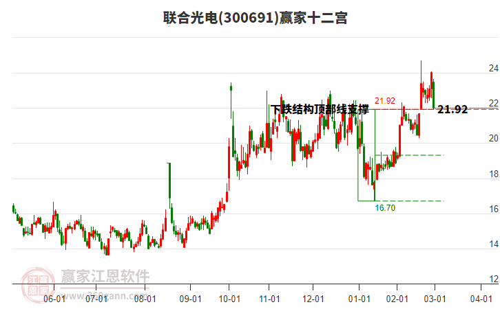 聯(lián)合光電根據(jù)贏家江恩極反通道趨勢(shì)工具展示,上方壓力位19.2077,下方支撐位17.3919。聯(lián)合光電處于贏家江恩空頭主線形態(tài),從1月23日形成頂分型后持續(xù)下跌,今日形成短期初次筑頂信號(hào),短期多頭趨勢(shì)