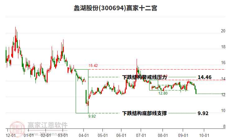 蠡湖股份處于贏家江恩多頭主線形態(tài),1月9日發(fā)出江恩筑頂信號后,經(jīng)過7日,今日再次發(fā)出江恩底分型并發(fā)出江恩筑底信號,中長期多頭趨勢依舊保持。蠡湖股份根據(jù)贏家江恩極反通道趨勢工具展示,上方壓力位13.52