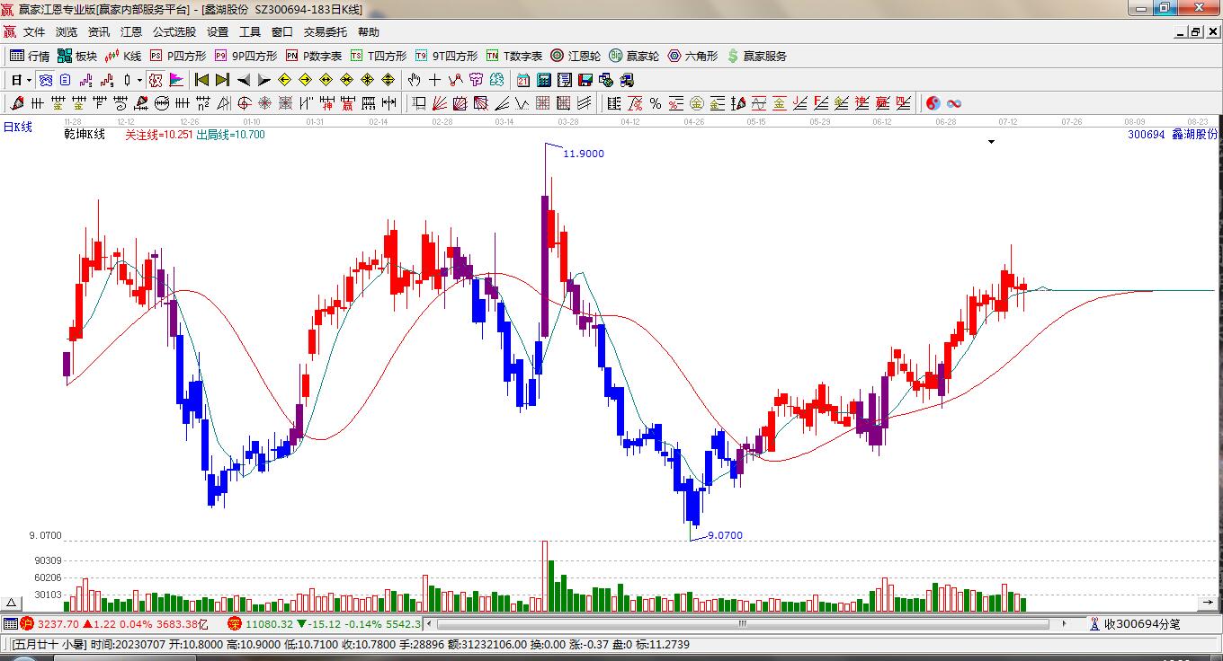 300694蠡湖股份根據(jù)贏家江恩極反通道趨勢工具展示,上方壓力位12.2316,下方支撐位10.5057。300694蠡湖股份處于贏家江恩多頭主線形態(tài),11月21日發(fā)出江恩筑頂信號后,經(jīng)過49日,今日
