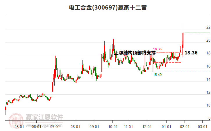 當(dāng)天電工合金300697最高價(jià)20.2挑戰(zhàn)了贏家極反通道工具藍(lán)色外軌線,受到藍(lán)色外軌線強(qiáng)力壓制,最終收盤停留在在藍(lán)色外軌線與生命線上方的強(qiáng)勢(shì)通道區(qū)域。電工合金300697近10個(gè)交易日漲幅10.73%