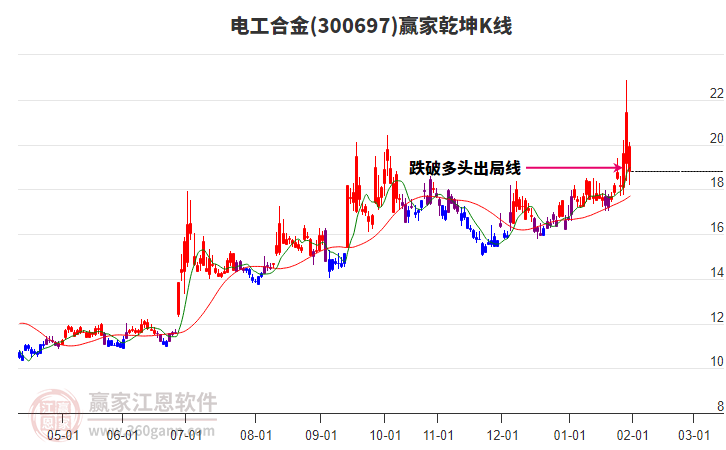 電工合金處于贏家江恩多頭次主線形態(tài),從1月29日形成頂分型后持續(xù)下跌,重心下移,今日跌破前低形成短期初次筑頂信號(hào),短期多頭趨勢(shì)已被破壞,中期雖然處于回調(diào)中,但長(zhǎng)期多頭趨勢(shì)延續(xù)。電工合金今日低開,截止目