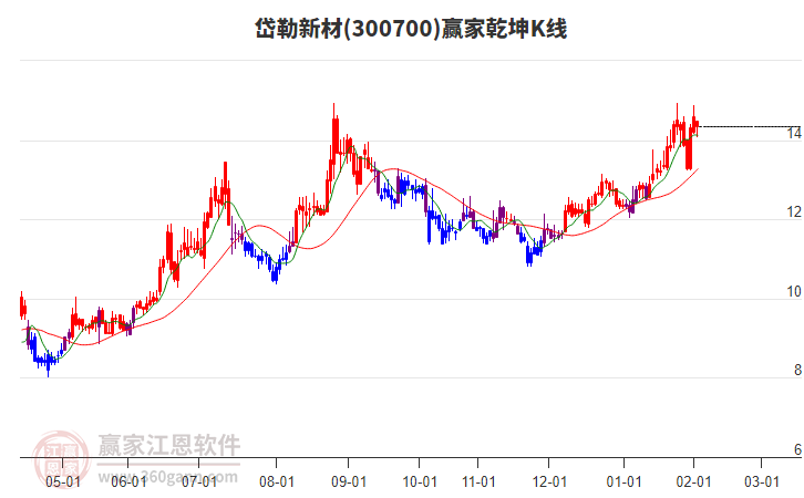 當(dāng)天300700岱勒新材最高價(jià)14.11挑戰(zhàn)了贏家極反通道工具藍(lán)色外軌線(xiàn),受到藍(lán)色外軌線(xiàn)強(qiáng)力壓制,最終收盤(pán)停留在在藍(lán)色外軌線(xiàn)與生命線(xiàn)上方的強(qiáng)勢(shì)通道區(qū)域。300700岱勒新材近10個(gè)交易日漲幅10.54