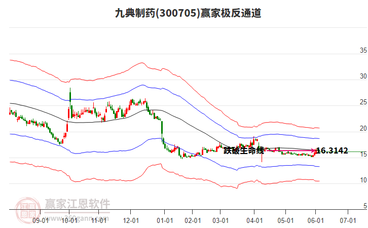 依據(jù)贏家江恩系統(tǒng)趨勢(shì)工具極反通道分析判斷九典制藥300705運(yùn)行在生命線以下弱勢(shì)區(qū)域,根據(jù)規(guī)則該股短線輕倉參與,股價(jià)跌至弱勢(shì)外軌線后波段再結(jié)合其它工具信號(hào)建倉。應(yīng)用口訣是:生命線上強(qiáng)勢(shì)走,生命線下難抬頭;紅黃兩條外軌線,壓力支撐顯勢(shì)頭。