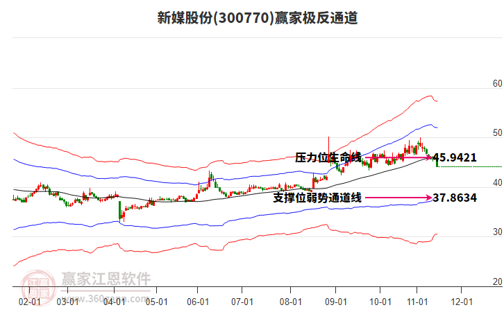 依據(jù)贏家江恩系統(tǒng)趨勢工具極反通道分析判斷新媒股份300770運(yùn)行在生命線以下弱勢區(qū)域,根據(jù)規(guī)則該股短線輕倉參與,股價(jià)跌至弱勢外軌線后波段再結(jié)合其它工具信號建倉。應(yīng)用口訣是:生命線上強(qiáng)勢走,生命線下難抬頭;紅黃兩條外軌線,壓力支撐顯勢頭。