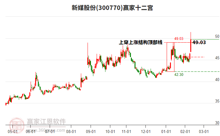 新媒股份處于贏家江恩多頭次主線形態(tài),12月26日發(fā)出江恩筑底信號后,經(jīng)過32日,今日形成短期筑頂信號,短期多頭趨勢已被破壞,中長期多頭趨勢依舊保持。新媒股份今日跳空低開,截止目前K線呈現(xiàn)上下影小陰線,