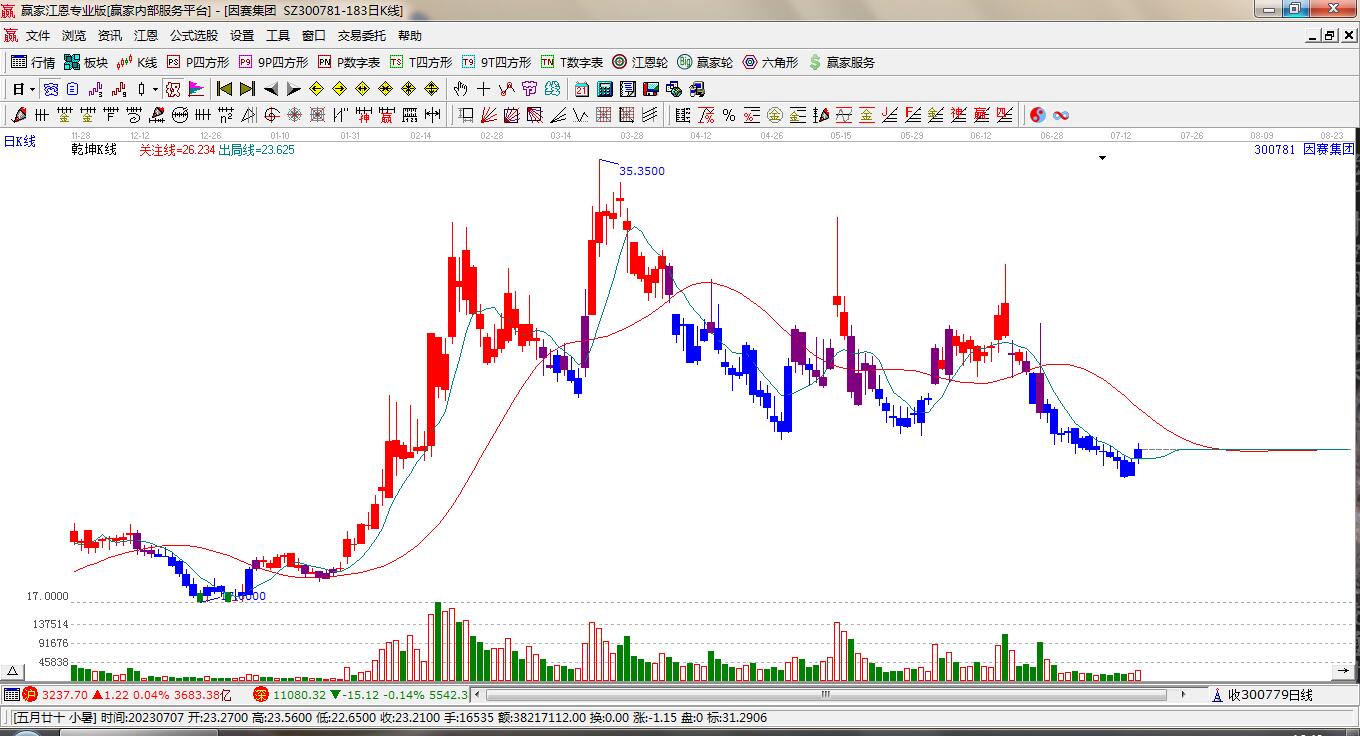 因賽集團(tuán)300781低開收陽線,上穿波段百分比工具關(guān)鍵點(diǎn)位39.65元