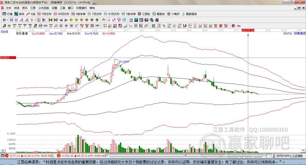 當(dāng)天因賽集團(tuán)最高價(jià)54.8上穿了贏家極反通道工具上方紅色外軌線,受到上方紅色外軌線強(qiáng)力壓制,最終收盤停留在在上方紅色外軌線與藍(lán)色外軌線上方的超強(qiáng)通道區(qū)域。因賽集團(tuán)近10個(gè)交易日漲幅54.98%。