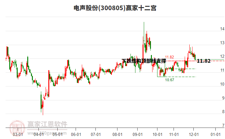 周二300805電聲股份最高價13.68挑戰(zhàn)了贏家極反通道工具藍色外軌線,受到藍色外軌線強力壓制,最終收盤停留在在藍色外軌線與生命線上方的強勢通道區(qū)域。300805電聲股份近10個交易日漲幅3.51%