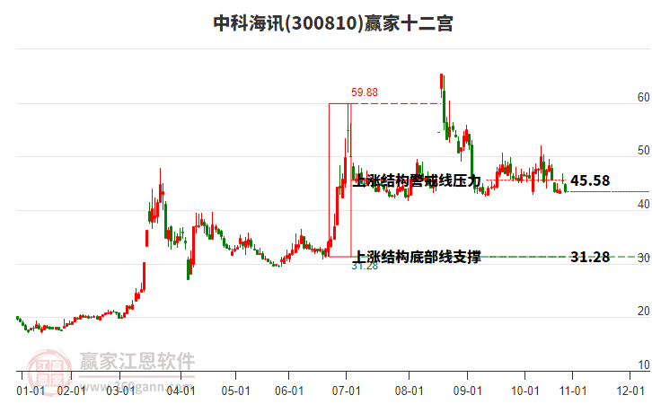 中科海訊(300810)處于贏家江恩多頭中期回調(diào)形態(tài),10月9日發(fā)出江恩筑頂信號(hào)后,經(jīng)過88日,今日再次發(fā)出江恩底分型并發(fā)出江恩筑底信號(hào),中期多頭反彈趨勢(shì)延續(xù),但長期處于回調(diào)中。中科海訊今日低開,截止