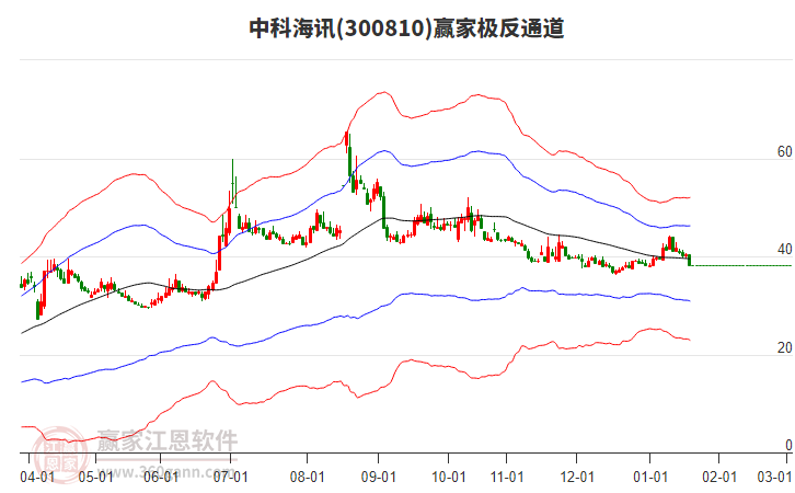 依據(jù)贏家江恩系統(tǒng)趨勢(shì)工具極反通道分析判斷中科海訊300810運(yùn)行在生命線以下弱勢(shì)區(qū)域,根據(jù)規(guī)則該股短線輕倉參與,股價(jià)跌至弱勢(shì)外軌線后波段再結(jié)合其它工具信號(hào)建倉。應(yīng)用口訣是:生命線上強(qiáng)勢(shì)走,生命線下難抬頭;紅黃兩條外軌線,壓力支撐顯勢(shì)頭。