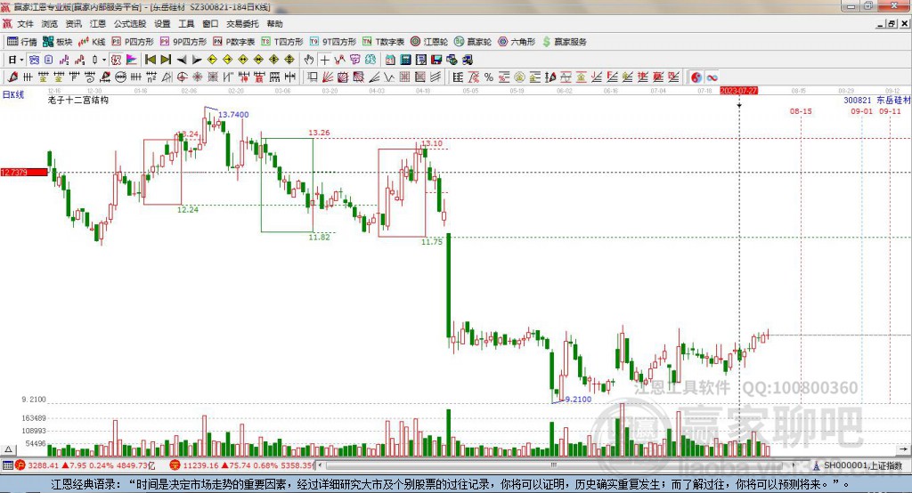 300821東岳硅材處于贏家江恩多頭次主線形態(tài),12月26日發(fā)出江恩筑底信號后,經(jīng)過21日,今日形成短期筑頂信號,短期多頭趨勢已被破壞,中長期多頭趨勢依舊保持。東岳硅材今日低開后持續(xù)下跌,截止目前股價
