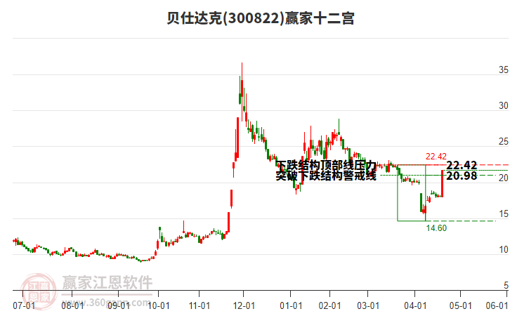 今天貝仕達(dá)克300822最高價20.8挑戰(zhàn)了贏家極反通道工具藍(lán)色外軌線,受到藍(lán)色外軌線強(qiáng)力壓制,最終收盤停留在在藍(lán)色外軌線與生命線上方的強(qiáng)勢通道區(qū)域。貝仕達(dá)克300822近10個交易日漲幅10.19%