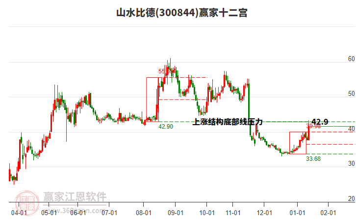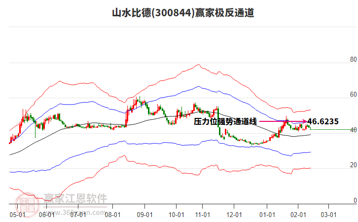 依據(jù)贏家江恩系統(tǒng)趨勢工具極反通道分析判斷山水比德300844運行在生命線以下弱勢區(qū)域,根據(jù)規(guī)則該股短線輕倉參與,股價跌至弱勢外軌線后波段再結(jié)合其它工具信號建倉。應(yīng)用口訣是:生命線上強勢走,生命線下難抬頭;紅黃兩條外軌線,壓力支撐顯勢頭。