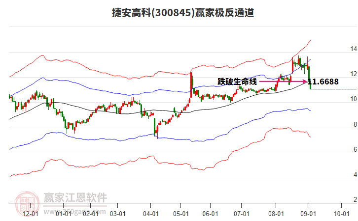 依據(jù)贏家江恩系統(tǒng)趨勢(shì)工具極反通道分析判斷捷安高科300845運(yùn)行在生命線以下弱勢(shì)區(qū)域,根據(jù)規(guī)則該股短線輕倉(cāng)參與,股價(jià)跌至弱勢(shì)外軌線后波段再結(jié)合其它工具信號(hào)建倉(cāng)。應(yīng)用口訣是:生命線上強(qiáng)勢(shì)走,生命線下難抬頭;紅黃兩條外軌線,壓力支撐顯勢(shì)頭。