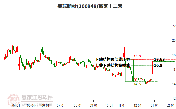 300848美瑞新材低開收穿頭破腳大陽線,12月29日收盤價為16.01