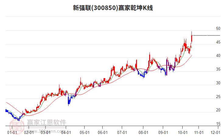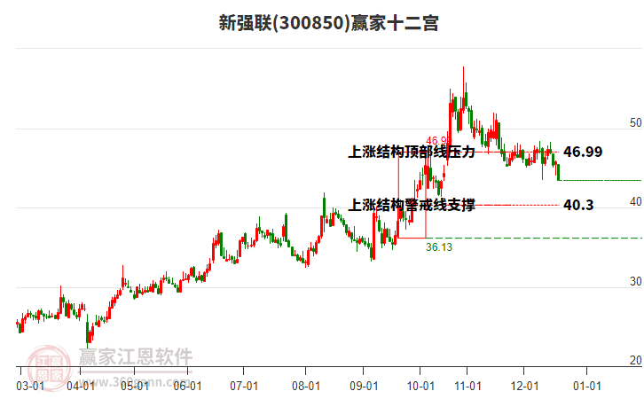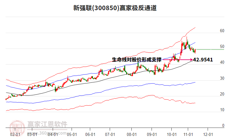 依據(jù)贏家江恩系統(tǒng)趨勢工具極反通道分析判斷新強聯(lián)300850運行在生命線以下弱勢區(qū)域,根據(jù)規(guī)則該股短線輕倉參與,股價跌至弱勢外軌線后波段再結(jié)合其它工具信號建倉。應(yīng)用口訣是:生命線上強勢走,生命線下難抬頭;紅黃兩條外軌線,壓力支撐顯勢頭。