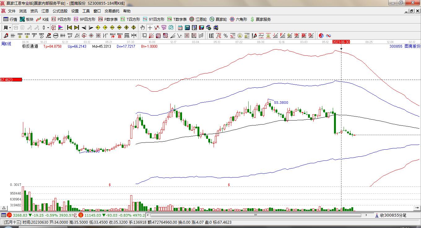 當(dāng)天圖南股份300855最高價(jià)33.96上穿了贏家極反通道工具藍(lán)色外軌線,受到藍(lán)色外軌線強(qiáng)力壓制,最終收盤停留在在藍(lán)色外軌線與生命線上方的強(qiáng)勢(shì)通道區(qū)域。圖南股份300855近10個(gè)交易日漲幅17.5%