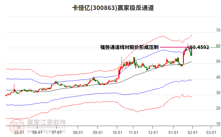 今天300863卡倍億最高價(jià)60.87挑戰(zhàn)了贏家極反通道工具藍(lán)色外軌線,受到藍(lán)色外軌線強(qiáng)力壓制,最終收盤停留在在藍(lán)色外軌線與生命線上方的強(qiáng)勢(shì)通道區(qū)域。300863卡倍億近10個(gè)交易日漲幅22.18%。