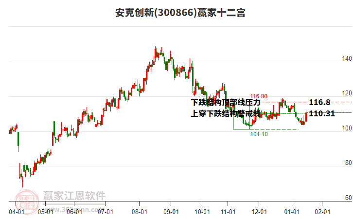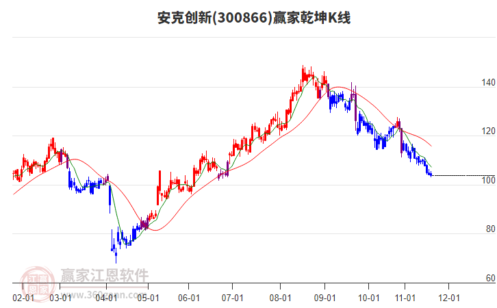 300866安克創(chuàng)新處于贏家江恩多頭主線形態(tài),9月22日發(fā)出江恩筑頂信號后,經(jīng)過84日,今日再次發(fā)出江恩底分型并發(fā)出江恩筑底信號,中期多頭趨勢延續(xù),但長期處于回調(diào)中。安克創(chuàng)新今日低開,截止目前小幅上漲