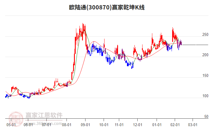 歐陸通(300870)處于贏家江恩多頭次主線形態(tài),從1月9日形成頂分型后持續(xù)下跌,重心下移,今日跌破前低形成短期初次筑頂信號,短期多頭趨勢已被破壞,中期多頭趨勢延續(xù),但長期處于回調中。歐陸通今日低開后