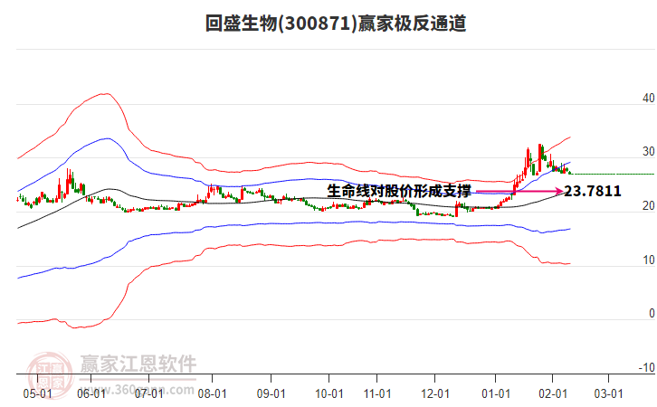 依據(jù)贏家江恩系統(tǒng)趨勢(shì)工具極反通道分析判斷回盛生物300871運(yùn)行在生命線以下弱勢(shì)區(qū)域,根據(jù)規(guī)則該股短線輕倉參與,股價(jià)跌至弱勢(shì)外軌線后波段再結(jié)合其它工具信號(hào)建倉。應(yīng)用口訣是:生命線上強(qiáng)勢(shì)走,生命線下難抬頭;紅黃兩條外軌線,壓力支撐顯勢(shì)頭。