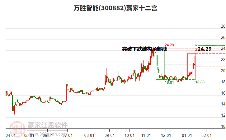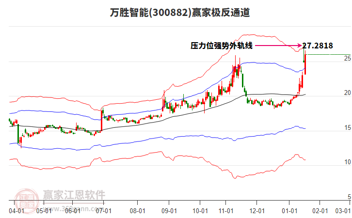 1月16日300882萬勝智能最高價27.65上穿了贏家極反通道工具上方紅色外軌線,受到上方紅色外軌線強力壓制,最終收盤停留在在上方紅色外軌線與藍色外軌線上方的超強通道區(qū)域。300882萬勝智能近10