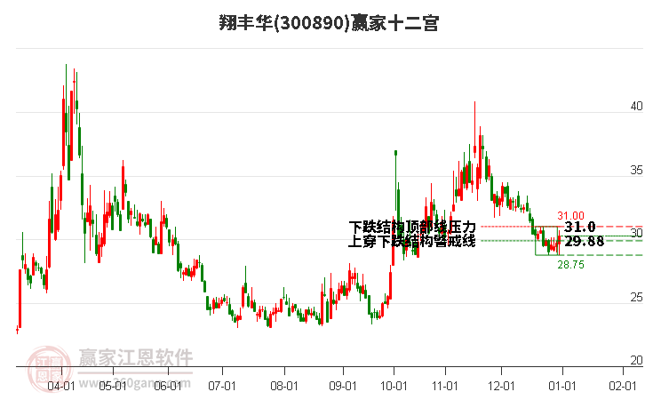 翔豐華處于贏家江恩多頭中期回調(diào)形態(tài),從1月26日形成頂分型后持續(xù)下跌,重心下移,今日跌破前低形成短期初次筑頂信號,短期多頭趨勢已被破壞,中期多頭反彈趨勢延續(xù),但長期處于回調(diào)中。翔豐華今日跳空低開,截止