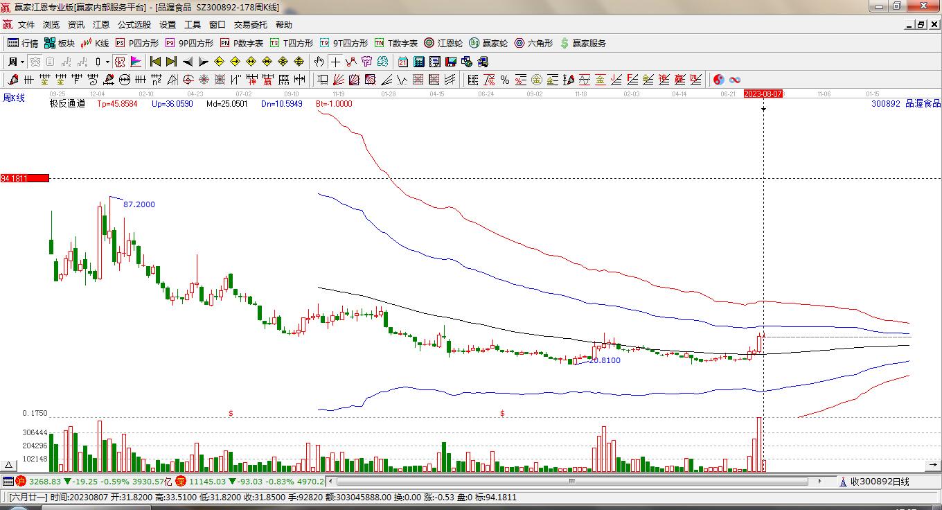 300892品渥食品處于贏家江恩空頭中期反彈形態(tài),從11月14日形成頂分型后持續(xù)下跌,重心下移,今日跌破前低形成短期初次筑頂信號(hào),短期多頭趨勢(shì)已被破壞,中期多頭趨勢(shì)延續(xù),但長(zhǎng)期處于下跌中。品渥食品今日