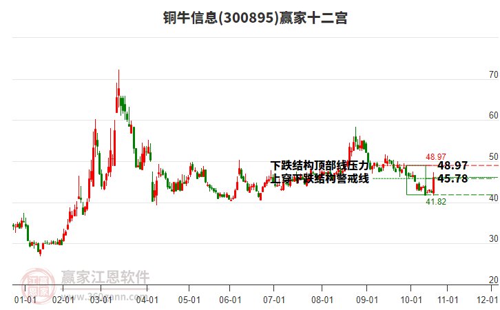 300895銅牛信息根據(jù)贏家江恩極反通道趨勢(shì)工具展示,上方壓力位51.9597,下方支撐位45.5278。300895銅牛信息處于贏家江恩多頭中期回調(diào)形態(tài),12月17日發(fā)出江恩筑頂信號(hào)后,經(jīng)過(guò)19日,