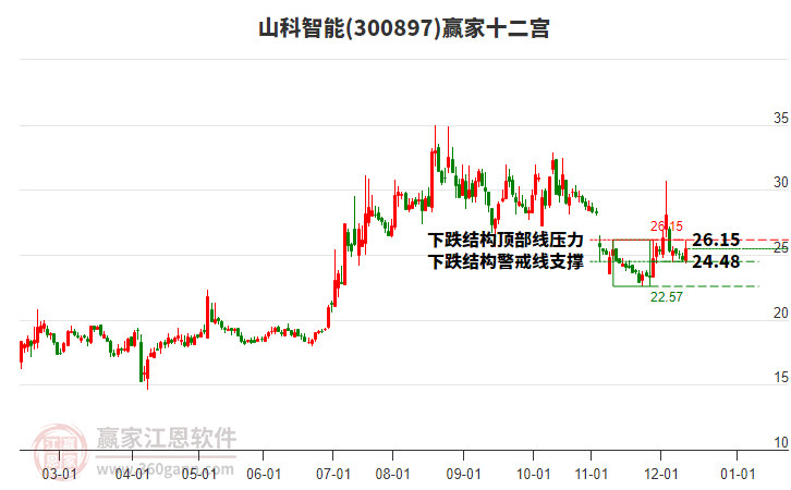 2月13日股價下穿前期2025年11月26日形成的下跌結(jié)構(gòu)頂部線,以上影小陰線收盤,微跌0.99%,近期高點為2月12日,跌至今日,持續(xù)1天,跌幅5.58%。依據(jù)贏家十二宮多空能量守恒規(guī)則,當(dāng)前股價下跌若不能收復(fù)下跌結(jié)構(gòu)頂部線26.15,多方能量持續(xù)萎縮,空方動能充足,將會進(jìn)一步下探警戒線24.48,若能再次收復(fù)下跌結(jié)構(gòu)頂部線,有望再度展開上攻。