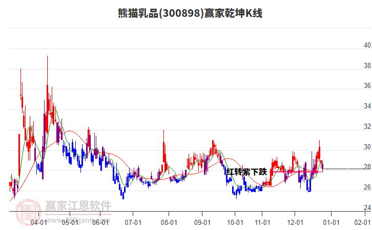 300898熊貓乳品處于贏家江恩多頭次主線形態(tài),從2月6日形成頂分型后持續(xù)下跌,重心下移,今日跌破前低形成短期初次筑頂信號,短期多頭趨勢已被破壞,中期雖然處于回調(diào)中,但長期多頭趨勢延續(xù)。300898熊