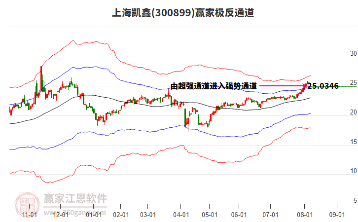 依據(jù)贏家江恩系統(tǒng)趨勢工具極反通道分析判斷上海凱鑫300899運行在生命線以下弱勢區(qū)域,根據(jù)規(guī)則該股短線輕倉參與,股價跌至弱勢外軌線后波段再結(jié)合其它工具信號建倉。應(yīng)用口訣是:生命線上強勢走,生命線下難抬頭;紅黃兩條外軌線,壓力支撐顯勢頭。