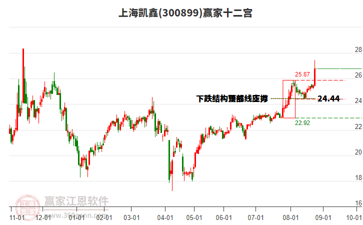 *ST凱鑫(300899)處于贏家江恩多頭次主線形態(tài),7月18日發(fā)出江恩筑底信號后,經(jīng)過160日,今日形成短期筑頂信號,短期多頭趨勢已被破壞,中期雖然處于回調(diào)中,但長期多頭趨勢延續(xù)。*ST凱鑫今日跳空