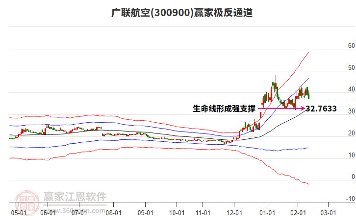 依據(jù)贏家江恩系統(tǒng)趨勢(shì)工具極反通道分析判斷廣聯(lián)航空300900運(yùn)行在生命線以下弱勢(shì)區(qū)域,根據(jù)規(guī)則該股短線輕倉(cāng)參與,股價(jià)跌至弱勢(shì)外軌線后波段再結(jié)合其它工具信號(hào)建倉(cāng)。應(yīng)用口訣是:生命線上強(qiáng)勢(shì)走,生命線下難抬頭;紅黃兩條外軌線,壓力支撐顯勢(shì)頭。