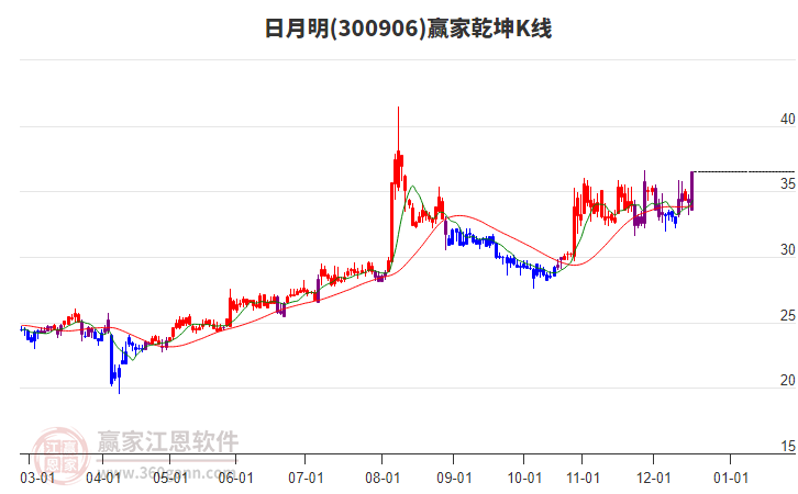 日月明當天低開收陽,收盤價為36.57,相較于昨日陽線收盤價34.47,上漲2.1元,小幅上漲6.09%,近兩日連收兩根陽線,近兩日呈現(xiàn)上漲趨勢,近15日股價呈上漲趨勢,今天K線以光頭光腳大陽線收盤,