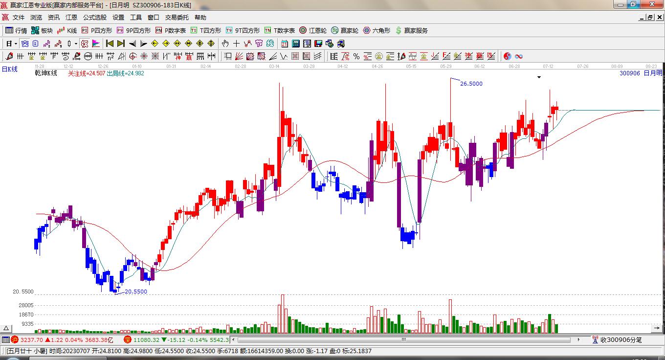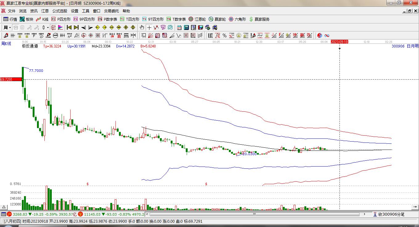 300906日月明處于贏家江恩多頭中期回調形態(tài),今日重心持續(xù)下移,短期延續(xù)下跌趨勢,5月29日發(fā)出中期江恩筑底信號后,經(jīng)過179日,今日形成中期筑頂信號,若持續(xù)下跌,觸發(fā)長期筑頂信號,300906日月