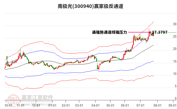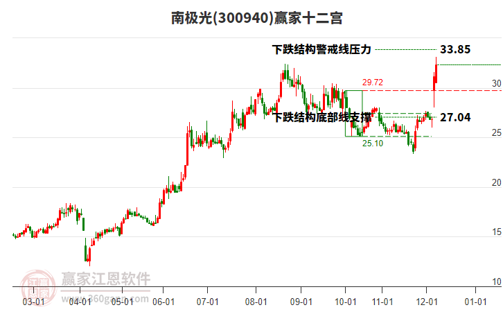 依據(jù)贏家江恩系統(tǒng)趨勢工具極反通道分析判斷南極光300940運行在生命線以下弱勢區(qū)域,根據(jù)規(guī)則該股短線輕倉參與,股價跌至弱勢外軌線后波段再結(jié)合其它工具信號建倉。應用口訣是:生命線上強勢走,生命線下難抬頭;紅黃兩條外軌線,壓力支撐顯勢頭。