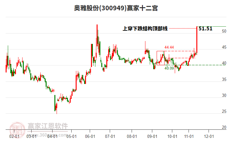 奧雅股份(300949)處于贏家江恩多頭次主線形態(tài),11月3日發(fā)出江恩筑底信號(hào)后,經(jīng)過(guò)65日,今日形成短期筑頂信號(hào),短期多頭趨勢(shì)已被破壞,中長(zhǎng)期目前都處于回調(diào)中。奧雅股份截至目前K線為上影小陰線,此K