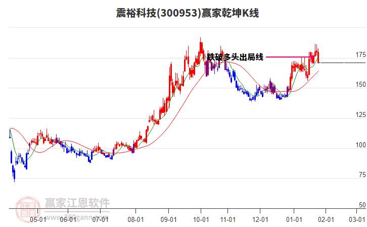 震裕科技(300953)處于贏家江恩多頭中期回調(diào)形態(tài),從1月22日形成頂分型后持續(xù)下跌,重心下移,今日跌破前低形成短期初次筑頂信號(hào),短期多頭趨勢(shì)已被破壞,中長(zhǎng)線均在空頭下跌趨勢(shì)中。震??萍糑線以上下影