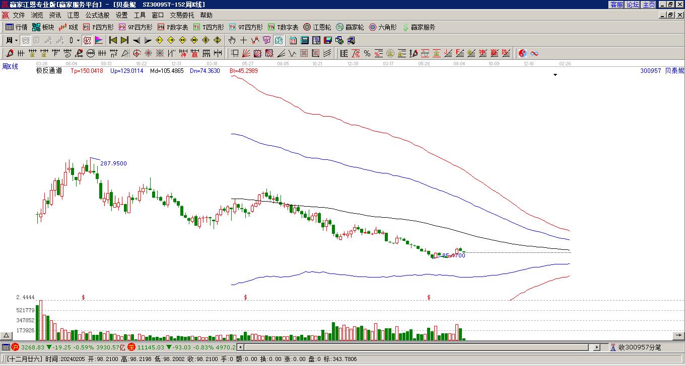 當天貝泰妮300957最高價49.36上穿了贏家極反通道工具上方紅色外軌線,受到上方紅色外軌線強力壓制,最終收盤停留在在上方紅色外軌線與藍色外軌線上方的超強通道區(qū)域。貝泰妮300957近10個交易日漲