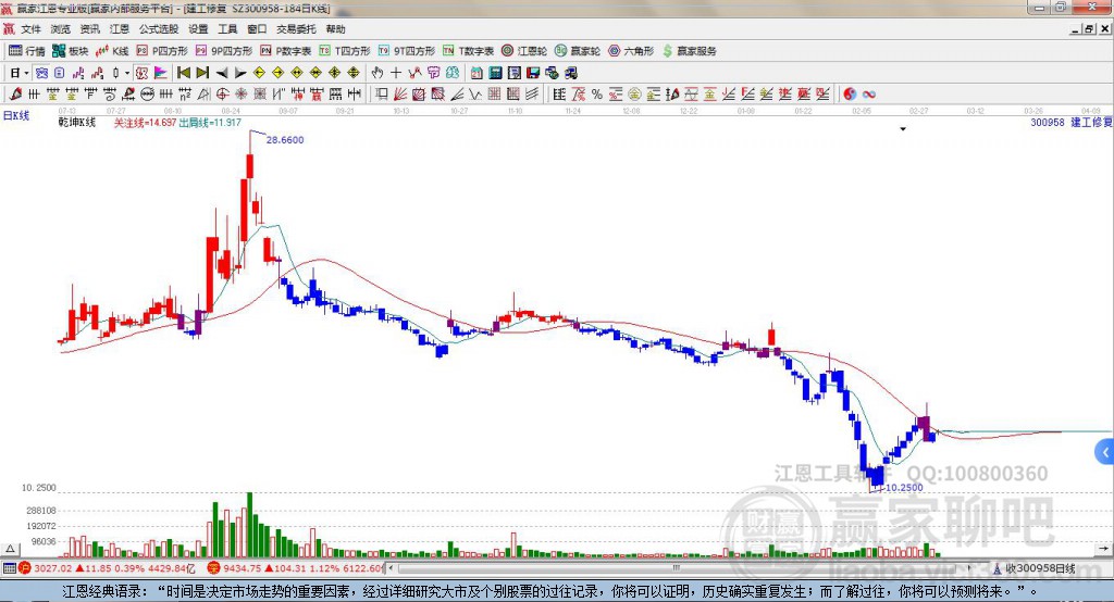 依據(jù)贏家江恩系統(tǒng)趨勢(shì)工具極反通道分析判斷建工修復(fù)300958運(yùn)行在生命線以下弱勢(shì)區(qū)域,根據(jù)規(guī)則該股短線輕倉參與,股價(jià)跌至弱勢(shì)外軌線后波段再結(jié)合其它工具信號(hào)建倉。應(yīng)用口訣是:生命線上強(qiáng)勢(shì)走,生命線下難抬頭;紅黃兩條外軌線,壓力支撐顯勢(shì)頭。