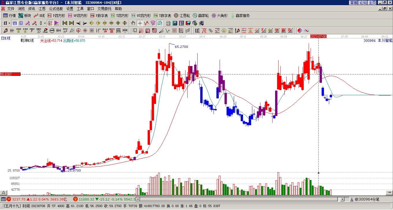 300964本川智能上漲遇阻 受藍(lán)色外軌線壓制 以穿頭破腳大陽線收盤
